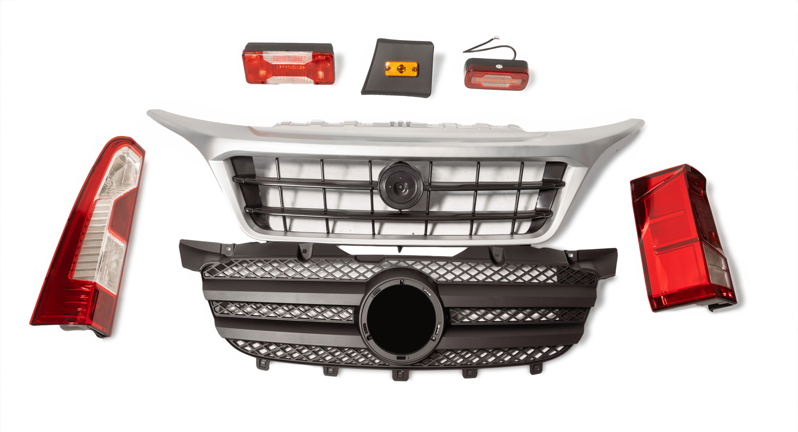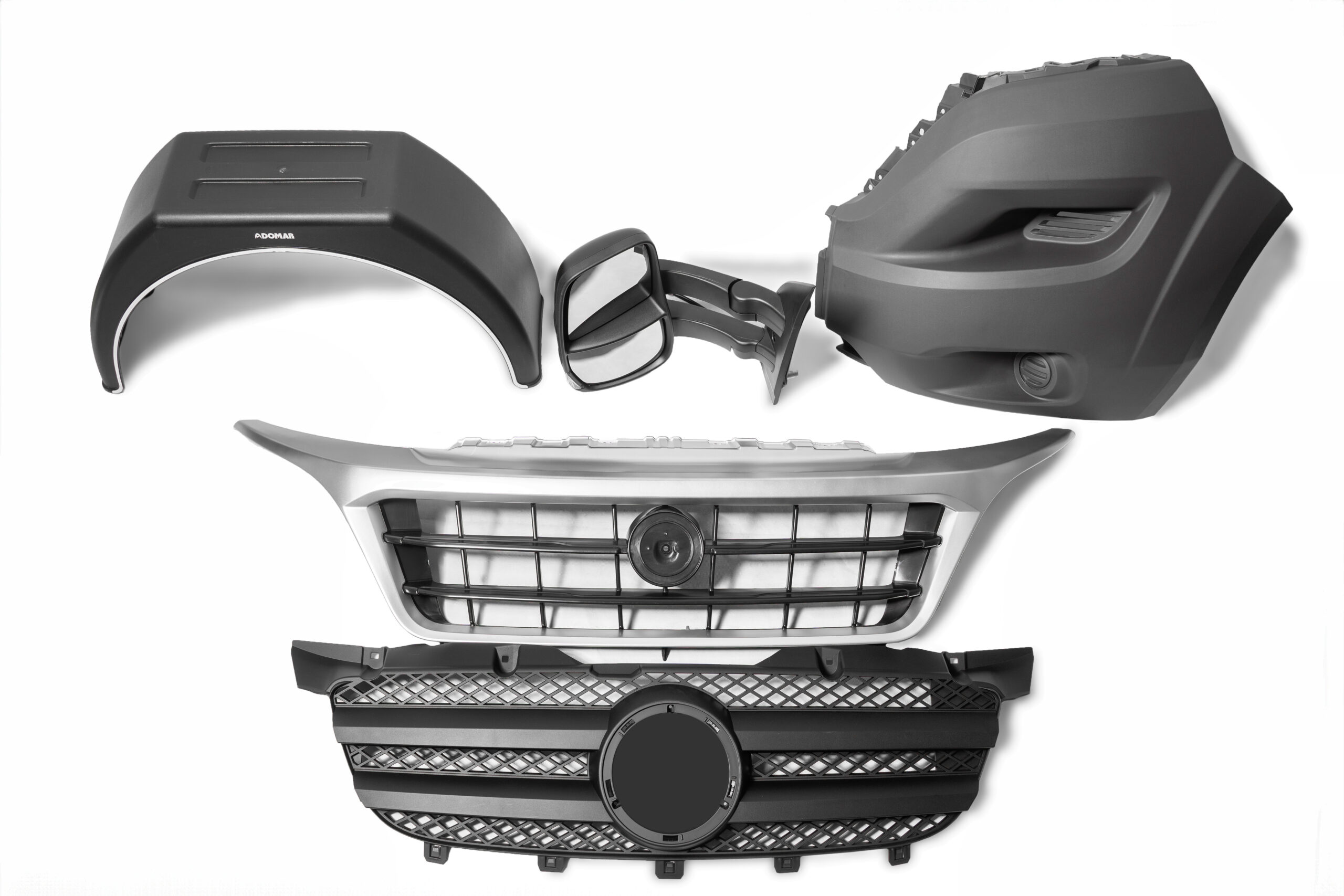 - Prednje maske (rešetke hladnjaka) – dostupne u svim potrebnim izvedbama za različite verzije vozila, od osobnih automobila do dostavnih vozila kao što su Fiat Ducato, Mercedes Sprinter, Renault Master ili Iveco Daily.